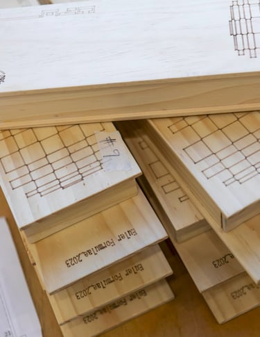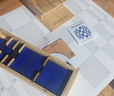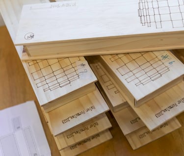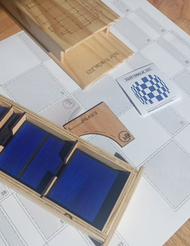 34 piezas de madera terciada de 5 mm pintadas a mano con pintura acrílica de arte y barnizadas con Barniz Osmo.